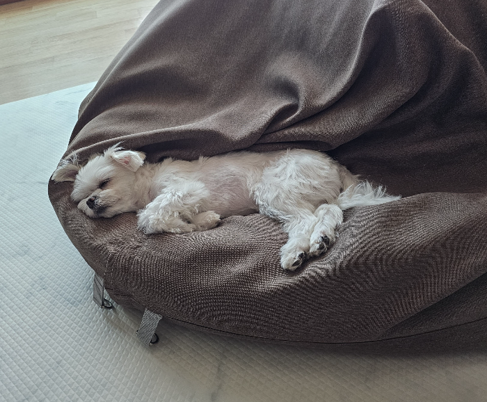 바닥에 뜨겁다는 걸 깜빡한 엄마에게 알려주려고 버텼나봐요. 안아들고 얼른 집으로 들어와 에이컨 바람을 쐬며 둘이 널부러져 있었던 기억이네요. 사람인 저는 바닥에 강아지인 '아리'는 빈백에... 뭔가 잘못된 것 같으면서도 자연스러웠던 우리 모습입니다.