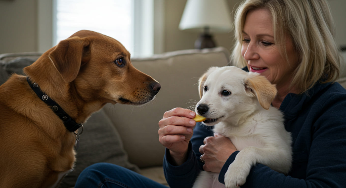 - 소량의 맛있는 간식으로 '손', '앉아' 같은 간단한 훈련을 살짝 시작할 수 있어요.